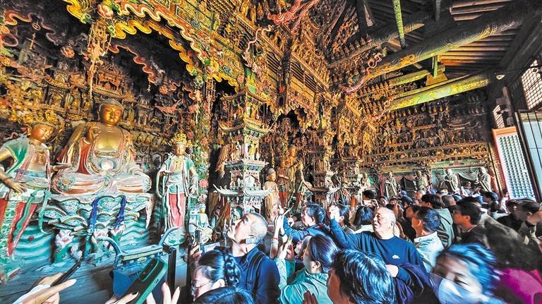 ▶10月24日,游客在隰县小西天景区观赏精美的悬塑艺术。