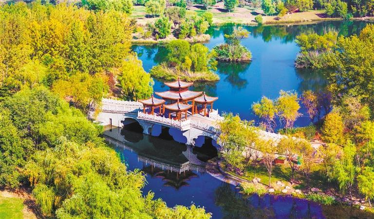 ▲10月29日拍摄的临汾市汾河文化生态景区。这里不仅是临汾的绿色生态名片,也是临汾人民的“城市会客厅”。