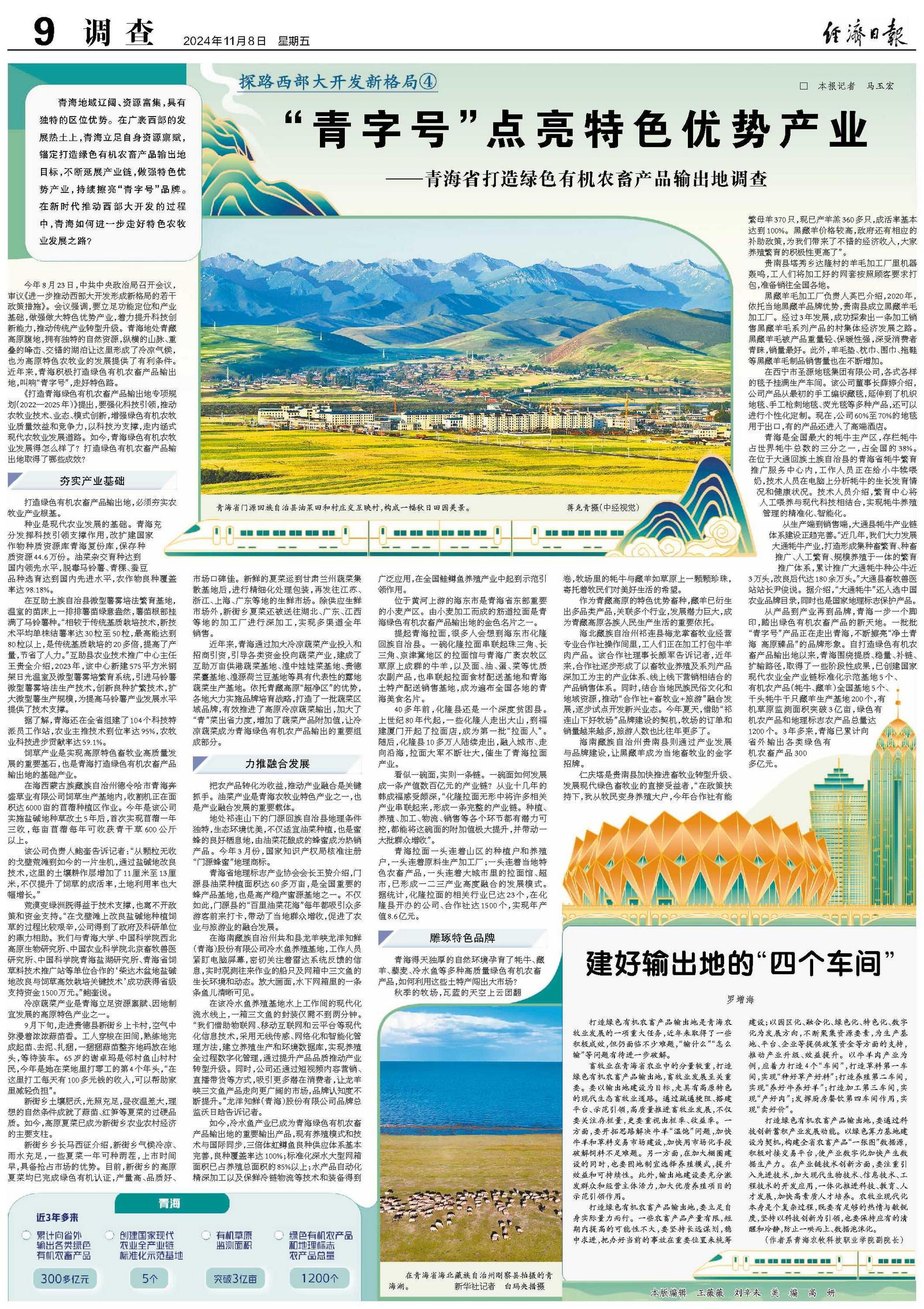 今年8月23日,中共中央政治局召开会议,审议《进一步推动西部大开发形成新格局的若干政策措施》。会议强调,要立足功能定位和产业基础,做强做大特色优势产业,着力提升科技创新能力,推动传统产业转型升级。青海地处青藏高原腹地,拥有独特的自然资源,纵横的山脉、重叠的峰峦、交错的湖泊让这里形成了冷凉气候,也为高原特色农牧业的发展提供了有利条件。近年来,青海积极打造绿色有机农畜产品输出地,叫响“青字号”,走好特色路。
