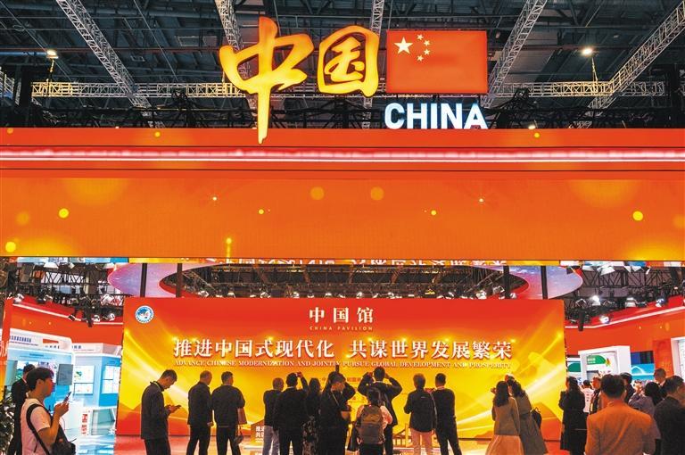 ▲11月5日,第七届进博会国家展中国馆吸引了众多观展者拍照留念。中国馆总展览面积1500平方米,聚焦未来网络、深海空天开发、人工智能、新能源等多个热门领域,重点展示推进中国式现代化建设和推动高水平对外开放的最新成果。本报记者 朱双健摄