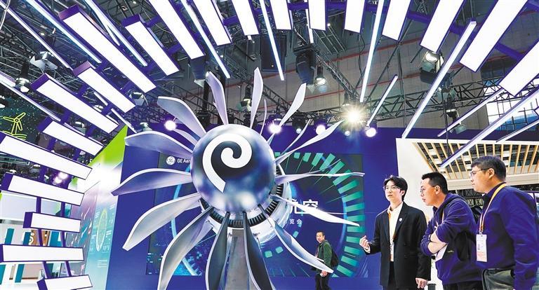▲11月8日,进博会技术装备展区通用电气航空航天展台,工作人员在介绍一款可持续发动机验证模型。本报记者 赵 晶摄