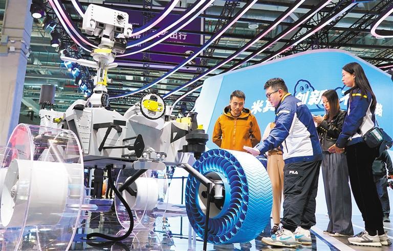 ▲11月7日,进博会汽车展区米其林展台,工作人员向观众介绍月球探测车专用免充气轮胎。本报记者 赵 晶摄