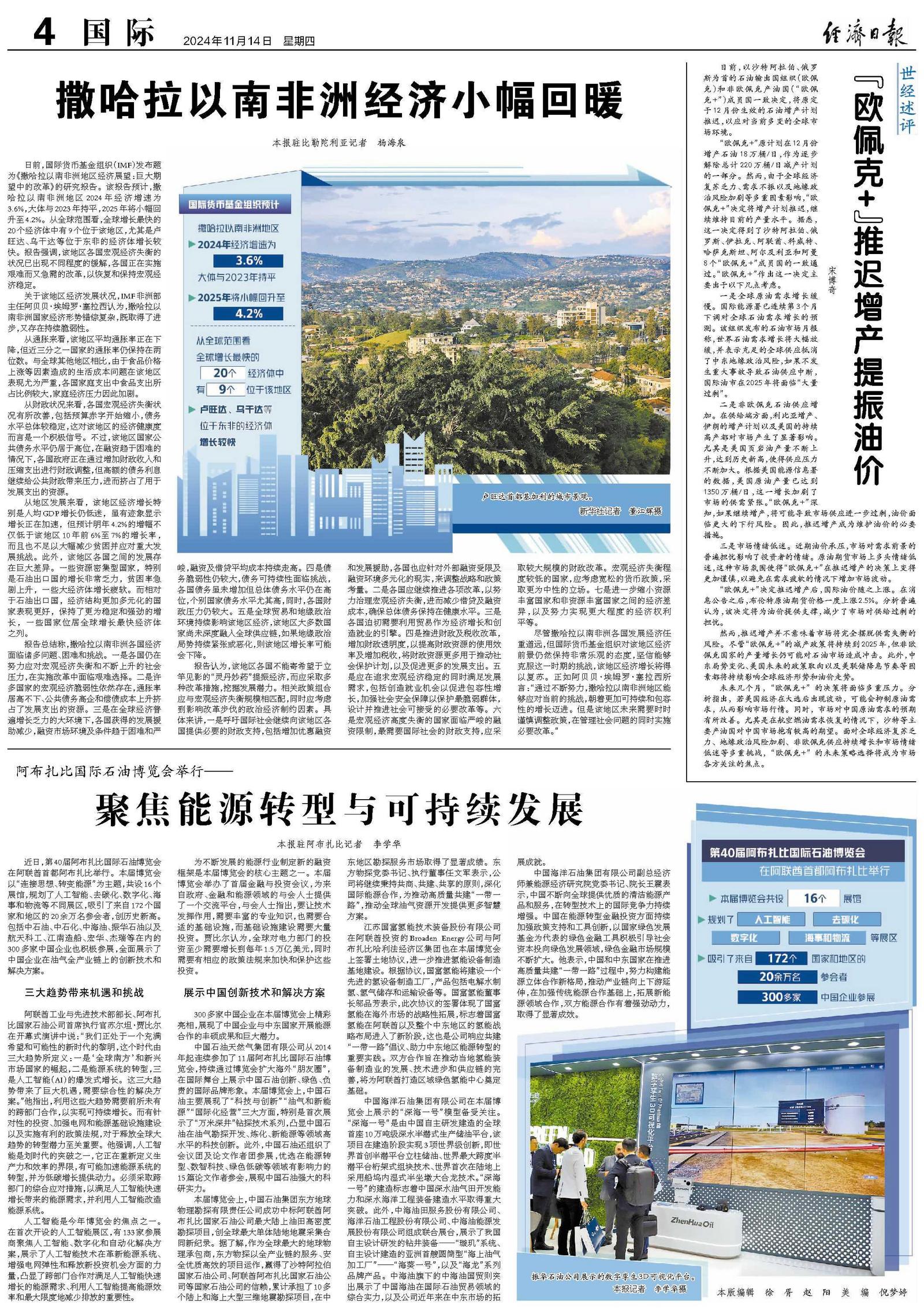 阿联酋工业与先进技术部部长、阿布扎比国家石油公司首席执行官苏尔坦·贾比尔在开幕式演讲中说:“我们正处于一个充满希望和可能性的新时代的黎明,这个时代由三大趋势所定义:一是‘全球南方’和新兴市场国家的崛起,二是能源系统的转型,三是人工智能(AI)的爆发式增长。这三大趋势带来了巨大机遇,需要综合性的解决方案。”他指出,利用这些大趋势需要前所未有的跨部门合作,以实现可持续增长。而有针对性的投资、加强电网和能源基础设施建设以及实施有利的政策法规,对于释放全球大趋势的转型潜力至关重要。他强调,人工智能是划时代的突破之一,它正在重新定义生产力和效率的界限,有可能加速能源系统的转型,并为低碳增长提供动力。必须采取跨部门的综合应对措施,以满足人工智能快速增长带来的能源需求,并利用人工智能改造能源系统。