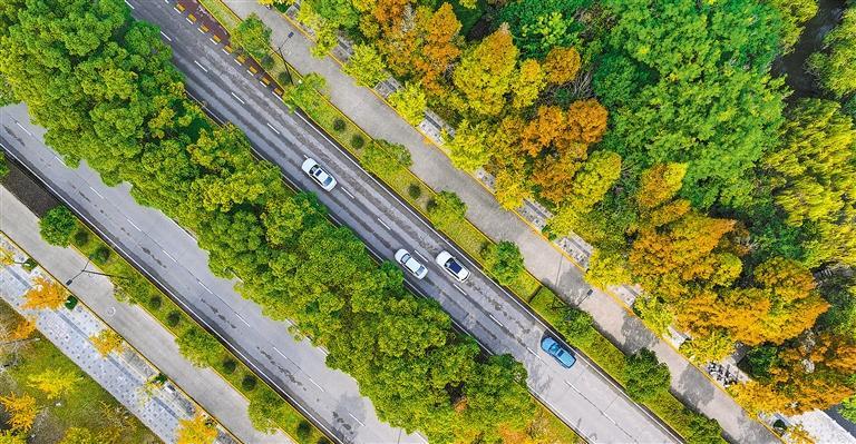 11月13日拍摄的浙江省湖州市长兴县龙山大道,道路两侧层林尽染,行人车辆如在画中。