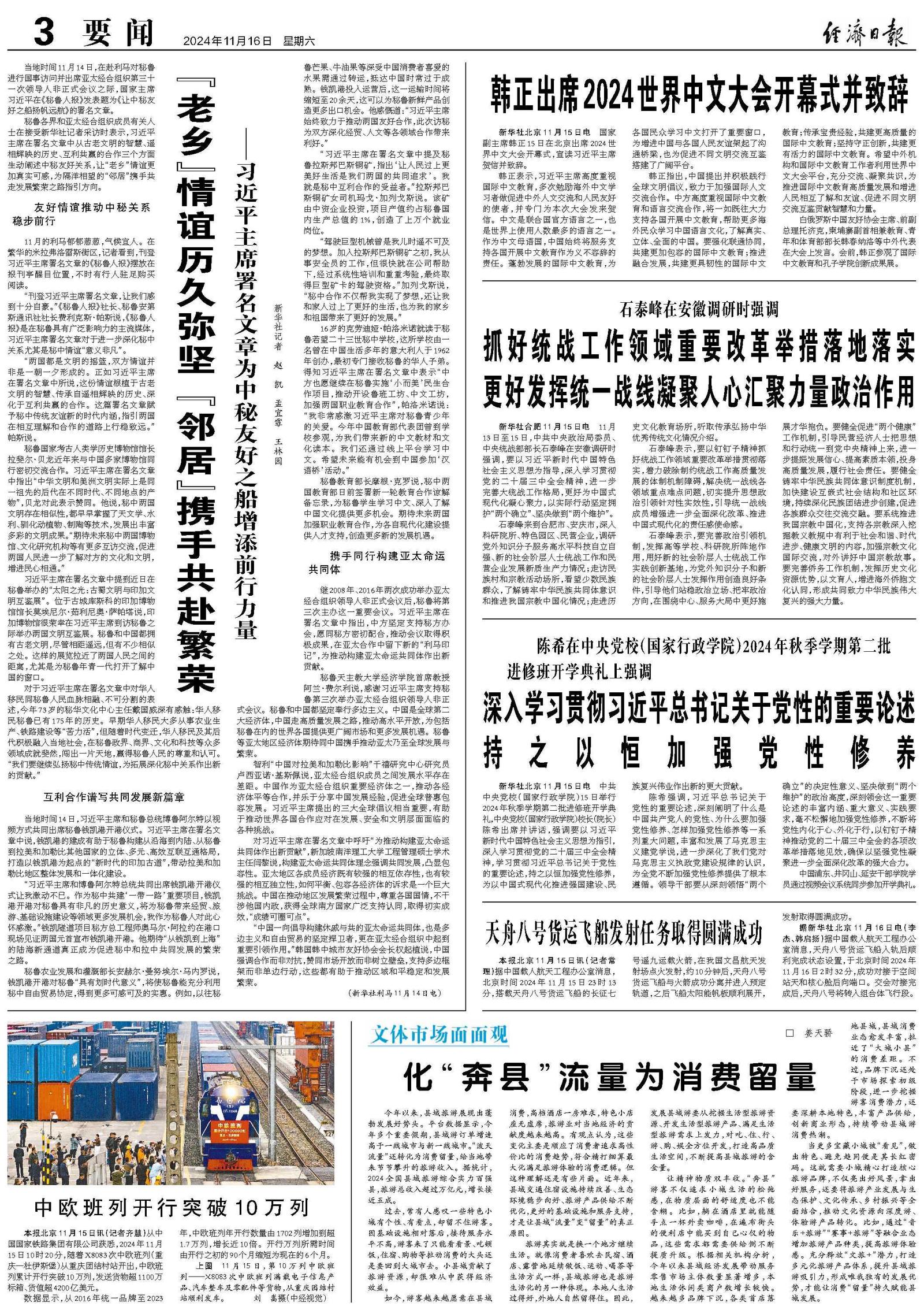 本报北京11月15日讯(记者常理)据中国载人航天工程办公室消息,北京时间2024年11月15日23时13分,搭载天舟八号货运飞船的长征七号遥九运载火箭,在我国文昌航天发射场点火发射,约10分钟后,天舟八号货运飞船与火箭成功分离并进入预定轨道,之后飞船太阳能帆板顺利展开,发射取得圆满成功。