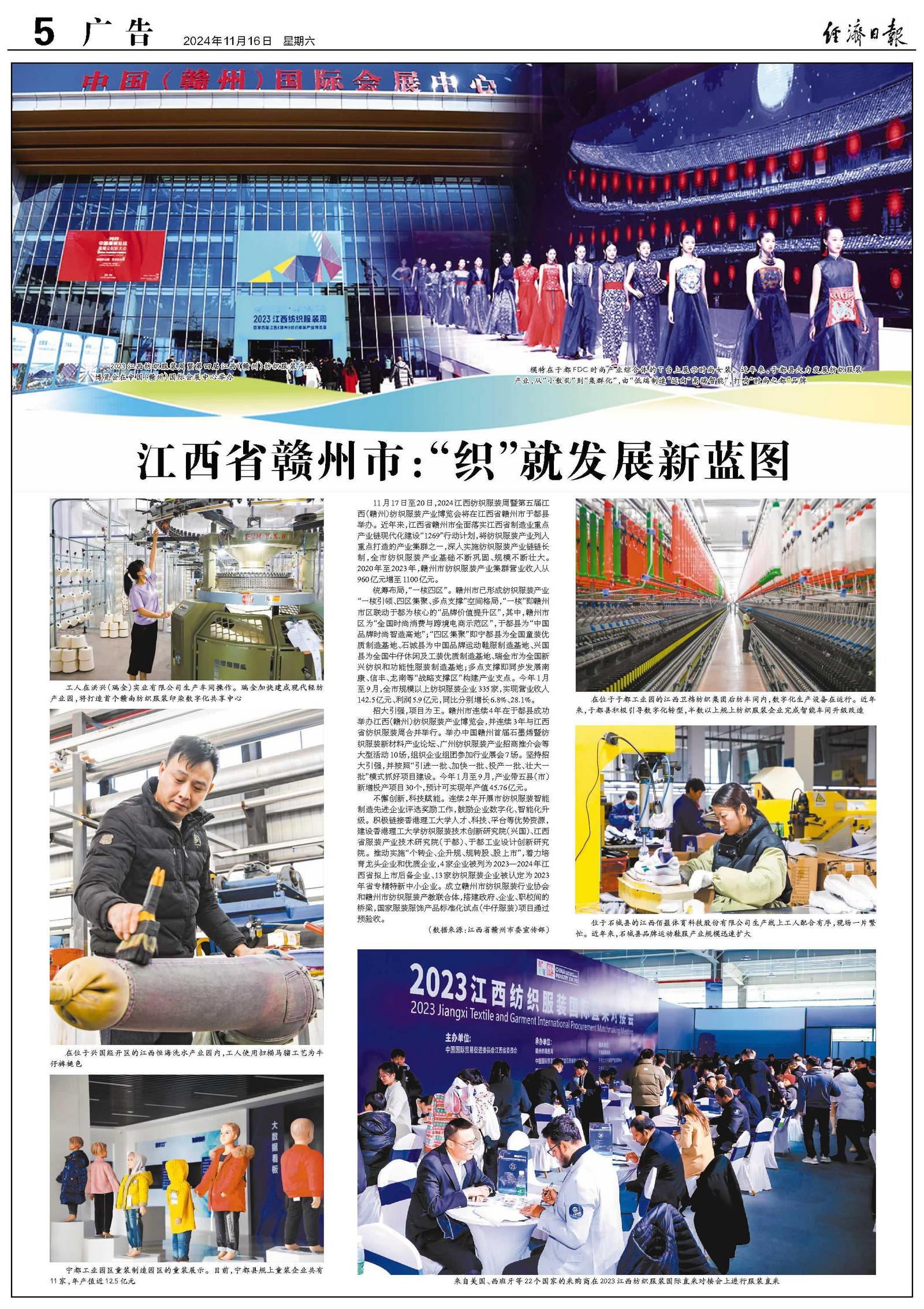 统筹布局,“一核四区”。赣州市已形成纺织服装产业“一核引领、四区集聚、多点支撑”空间格局,“一核”即赣州市区联动于都为核心的“品牌价值提升区”,其中,赣州市区为“全国时尚消费与跨境电商示范区”,于都县为“中国品牌时尚智造高地”;“四区集聚”即宁都县为全国童装优质制造基地、石城县为中国品牌运动鞋服制造基地、兴国县为全国牛仔休闲及工装优质制造基地、瑞金市为全国新兴纺织和功能性服装制造基地;多点支撑即同步发展南康、信丰、龙南等“战略支撑区”构建产业支点。今年1月至9月,全市规模以上纺织服装企业335家,实现营业收入142.5亿元、利润5.9亿元,同比分别增长6.8%、28.1%。
