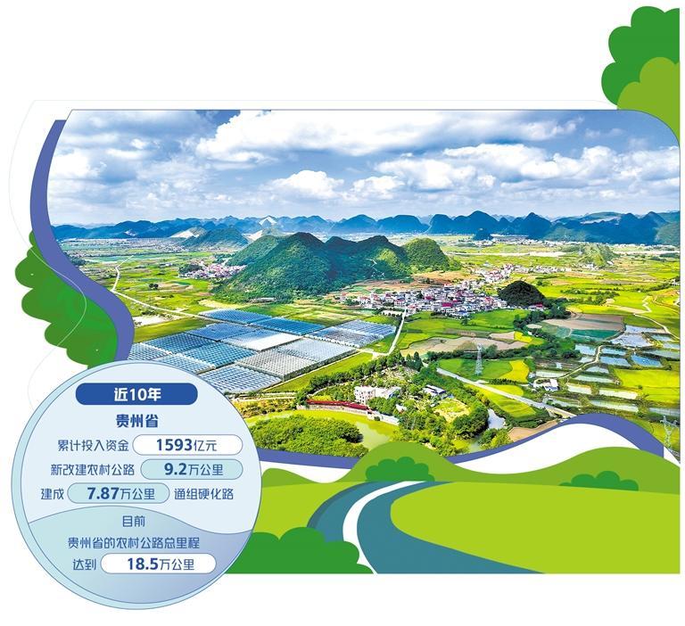 贵州省交通运输厅厅长张胤介绍,近10年,贵州省累计投入资金1593亿元,新改建农村公路9.2万公里,建成7.87万公里通组硬化路,分别在2017年、2019年先后在西部地区率先实现建制村100%“通硬化路、通客运”和30户以上村民组“组组通”硬化路,成为全国农村公路变化最显著、惠农最直接、影响最深远的省份之一。