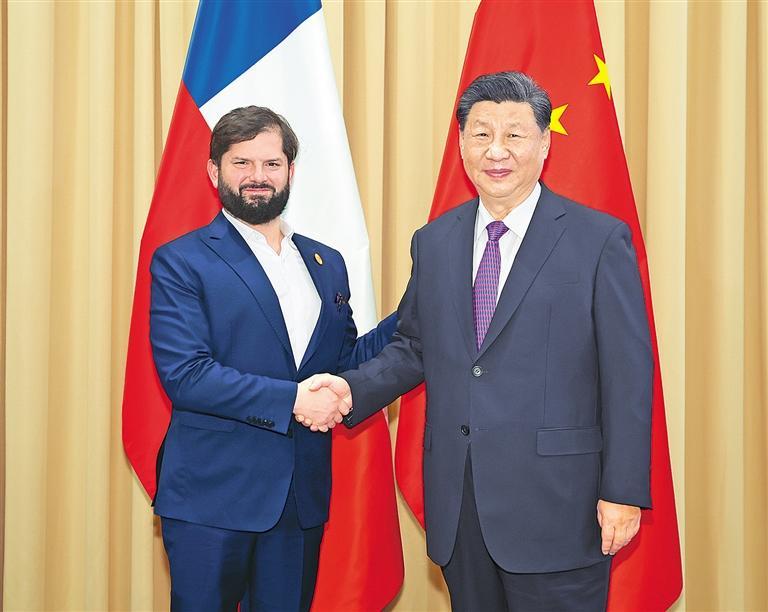 习近平强调,双方要加强各领域、各层级交往交流,坚持互尊互信、互利互惠、互联互通,不断丰富合作内容,加强基础设施、清洁能源、信息通信等领域合作,以高水平自由贸易和更开放的产业政策推动两国合作向更可持续、更宽领域迈进。中方欢迎更多智利优质产品出口到中国,支持更多中国企业赴智利投资兴业,希望智方为中国企业提供透明、开放、非歧视的营商环境。中方愿同智方加强在联合国、世界贸易组织、亚太经合组织等多边机制内沟通合作,践行真正的多边主义,维护全球供应链畅通稳定和全球南方共同利益,共同建设开放、活力、强韧、和平的亚太共同体。