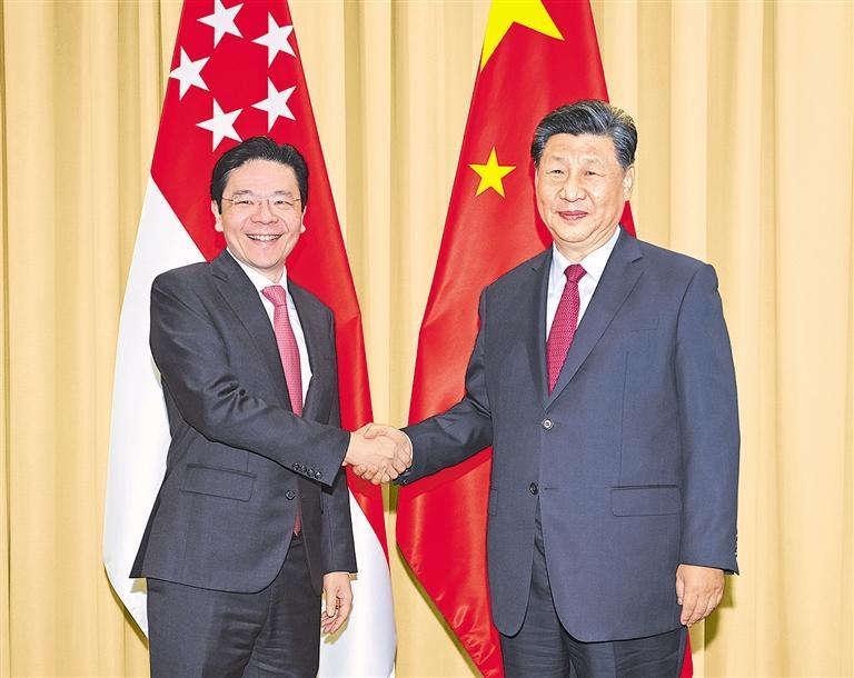 习近平强调,新加坡参与中国改革开放进程起步早、领域广、成果实。欢迎新方把握中国发展新机遇,继续建设好苏州工业园区、天津生态城、重庆示范性互联互通和广州知识城等合作项目,进一步打造数字经济、绿色发展、人工智能领域合作新增长点,不断扩大人文交流。面对世界百年变局,中方愿同新方加强在联合国、亚太经合组织等多边舞台上合作,共同倡导平等有序的世界多极化和普惠包容的经济全球化。
