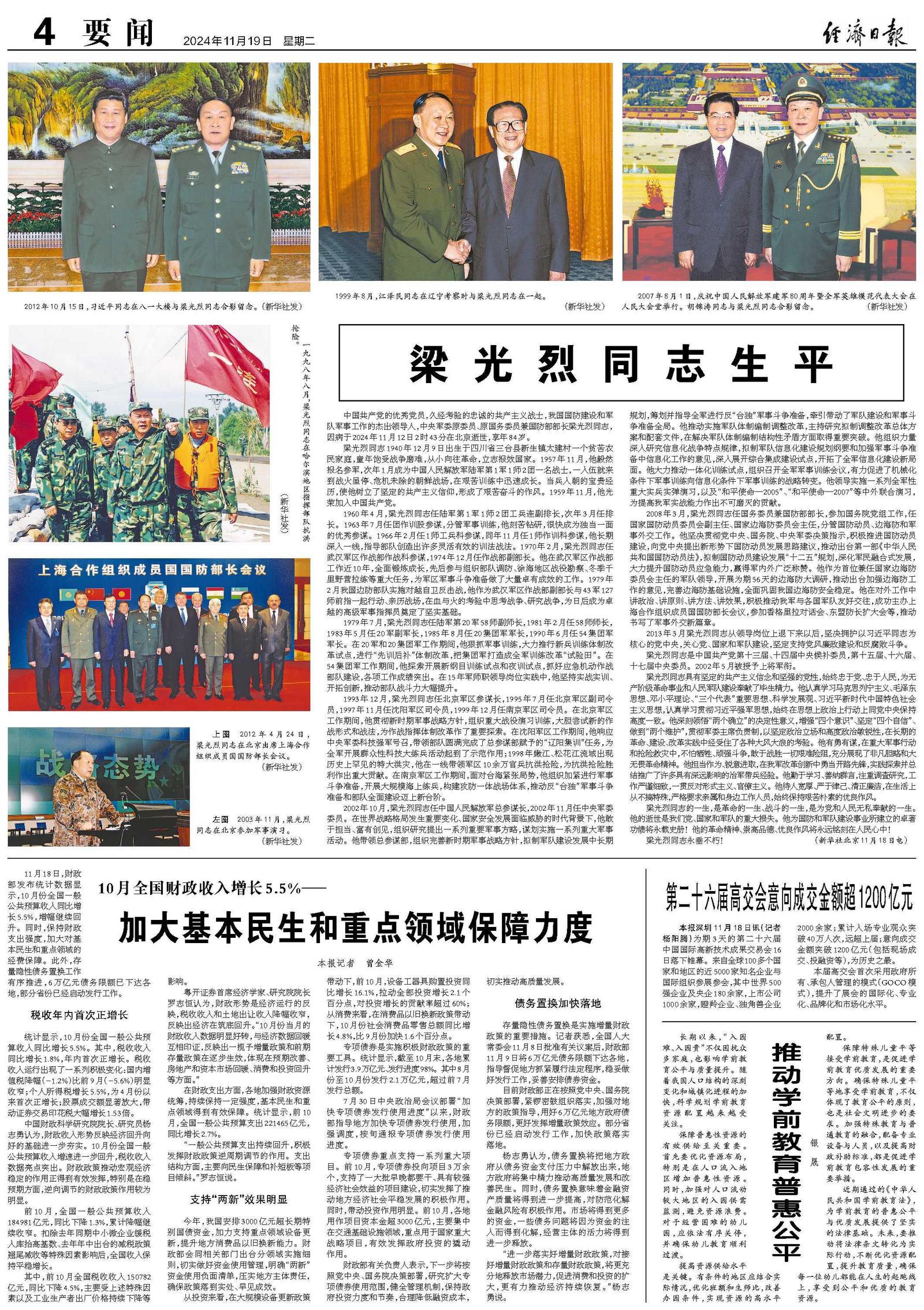 中国共产党的优秀党员,久经考验的忠诚的共产主义战士,我国国防建设和军队军事工作的杰出领导人,中央军委原委员、原国务委员兼国防部部长梁光烈同志,因病于2024年11月12日2时43分在北京逝世,享年84岁。