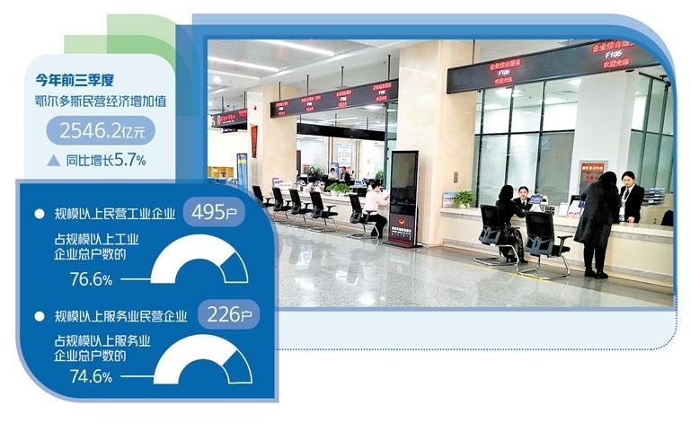 如今,民营经济已成为鄂尔多斯稳定增长、促进创新、增加就业、改善民生的重要力量。今年前三季度,鄂尔多斯民营经济增加值占地区生产总值的比重近六成,达2546.2亿元,同比增长5.7%。规模以上民营工业企业495户,占规模以上工业企业总户数的比重为76.6%,增加值同比增长7.7%,占规模以上工业增加值的比重为49.3%。规模以上服务业民营企业达226户,占规模以上服务业企业总户数的比重为74.6%,实现营业收入169.1亿元。