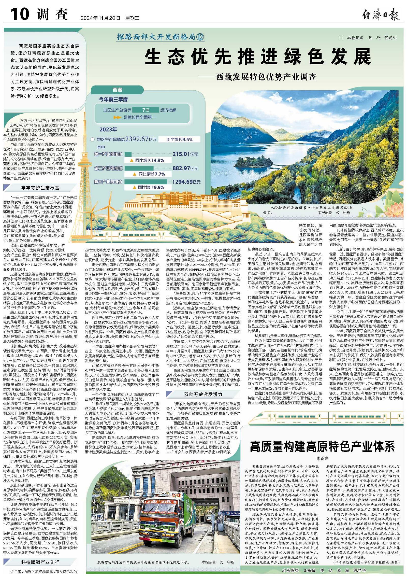 与此同时,西藏立足生态资源大力发展特色优势产业,聚焦“稳定、发展、生态、强边”四件大事,聚力高原经济高质量发展先行区等“四个创建”,文化旅游、清洁能源、绿色工业等九大产业蓬勃发展,高原经济持续向好。今年前三季度,西藏地区生产总值等7项经济指标增速位居全国第一。西藏是如何在守护绿色的同时又促进特色产业发展的?
