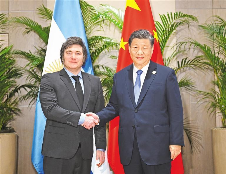 新华社里约热内卢11月19日电(记者孙浩 朱婉君)当地时间11月19日上午,国家主席习近平在里约热内卢出席二十国集团领导人峰会期间会见阿根廷总统米莱。
