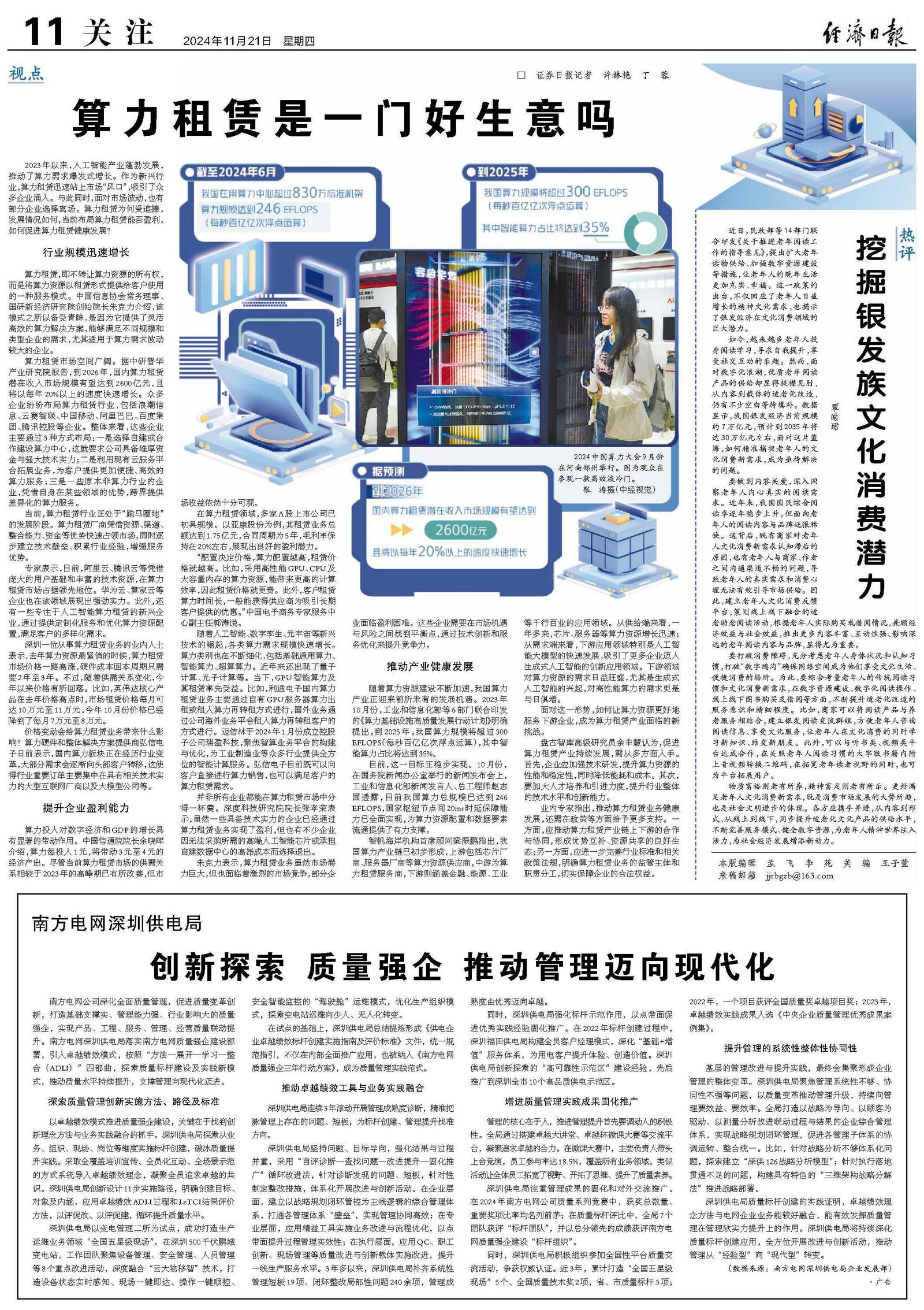 深圳一位从事算力租赁业务的业内人士表示,去年算力资源最紧俏的时候,算力租赁市场价格一路高涨,硬件成本回本周期只需要2年至3年。不过,随着供需关系变化,今年以来价格有所回落。比如,英伟达核心产品在去年价格高点时,市场租赁价格每月可达10万元至11万元,今年10月份价格已经降到了每月7万元至8万元。