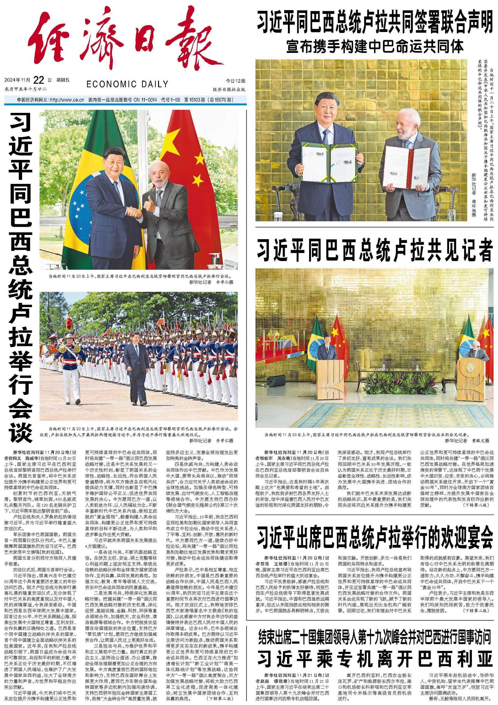 新华社巴西利亚11月20日电(记者宿亮 王植樱)当地时间11月20日晚,国家主席习近平在巴西利亚出席巴西总统卢拉举行的盛大欢迎宴会。