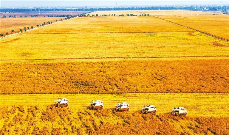 11月21日,在江苏省如皋市长江镇永建社区一座家庭农场,农机手驾驶收割机在田间收割水稻。眼下,如皋市64.4万亩水稻收割进入收尾阶段,田间地头一派繁忙。吴树建摄(中经视觉)