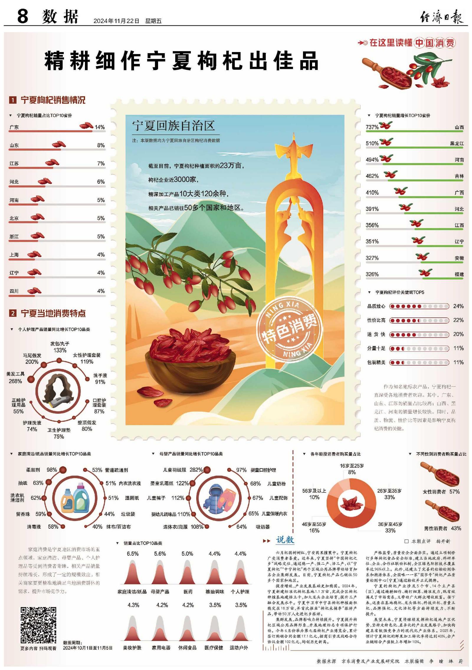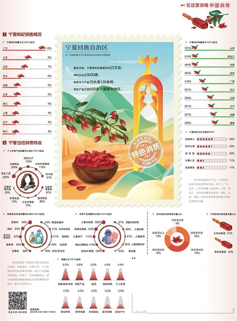 提质增效,产业发展基础更加稳固。2024年,宁夏新建标准化枸杞基地1.1万亩,完成全区枸杞种植基地建档立卡,加大龙头企业培育,提升三产融合发展水平。宁夏中卫市中宁县枸杞种植面积稳定在18万亩,并首次推出“枸杞采摘季”旅游产品,带动50万人走进杞乡旅游。