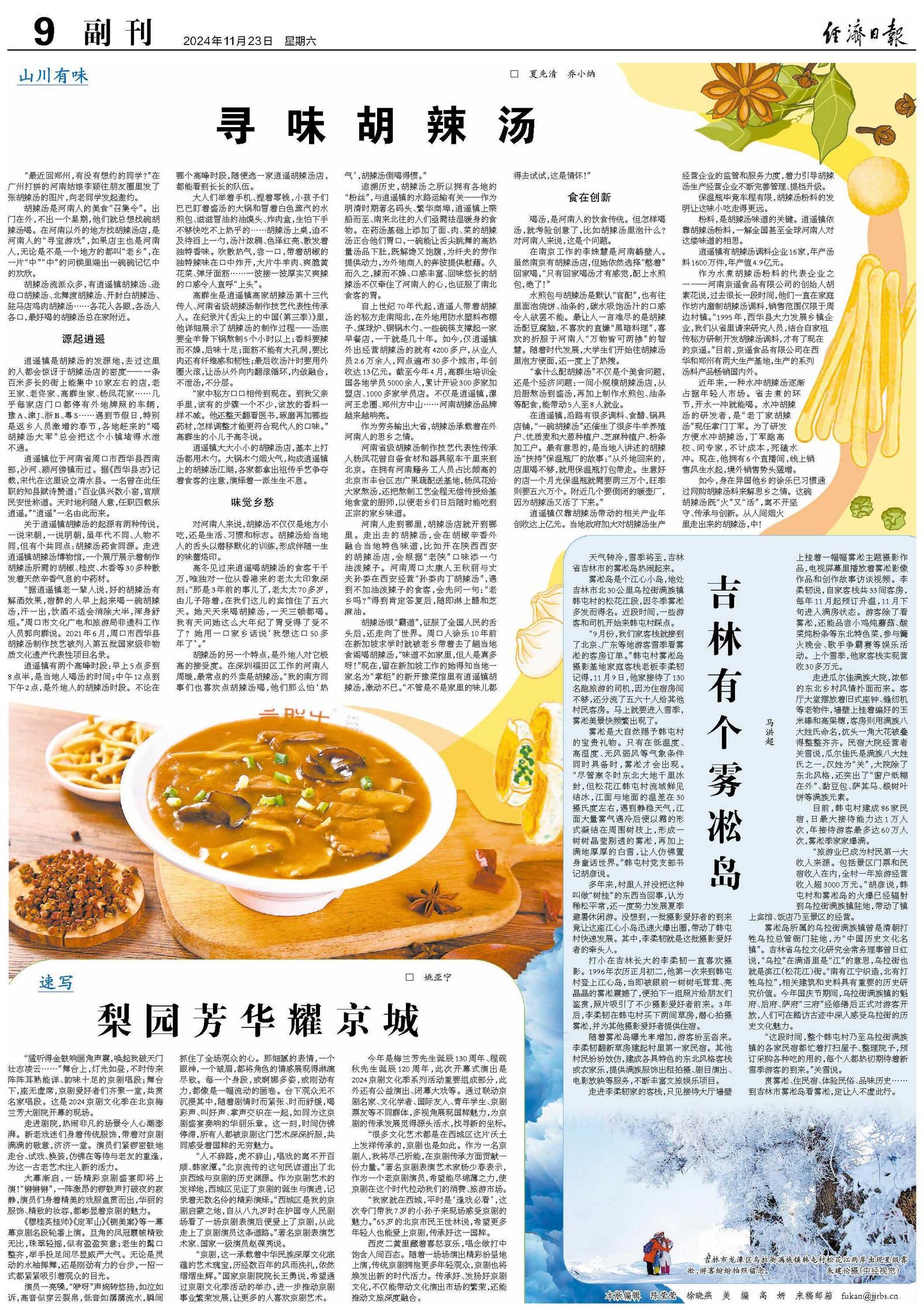 河南省级胡辣汤制作技艺代表性传承人杨凤花曾自备食材和器具驱车千里来到北京。在拥有河南籍务工人员占比颇高的北京市丰台区志广果蔬配送基地,杨凤花给大家熬汤,还把熬制工艺全程无偿传授给基地食堂的厨师,以便老乡们日后随时能吃到正宗的家乡味道。