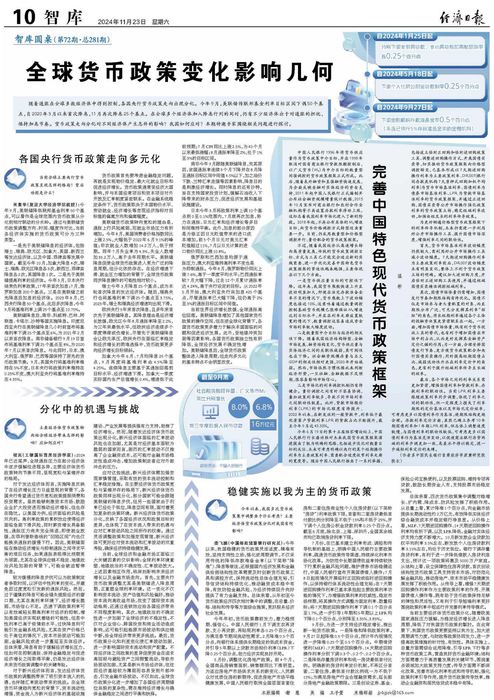 当前主要经济体货币政策分化,随着欧美国家通胀压力缓解,为稳定经济增长进入降息周期,降低了对我国货币政策的掣肘。在此背景下,我国货币政策更要坚持以我为主,加大逆周期调节力度,与财政等政策协同发力,进一步提高政策措施的针对性、有效性。具体实施上,总量方面需综合运用降准、引导LPR下行等多种货币政策工具,营造良好货币金融环境;结构方面需着力于高质量发展的关键环节,围绕重点领域加大政策支持力度;传导方面需不断深化改革,完善市场化利率形成和传导机制,强化政策利率引导作用,提升货币政策传导效率,推动企业融资和居民信贷成本稳中有降。