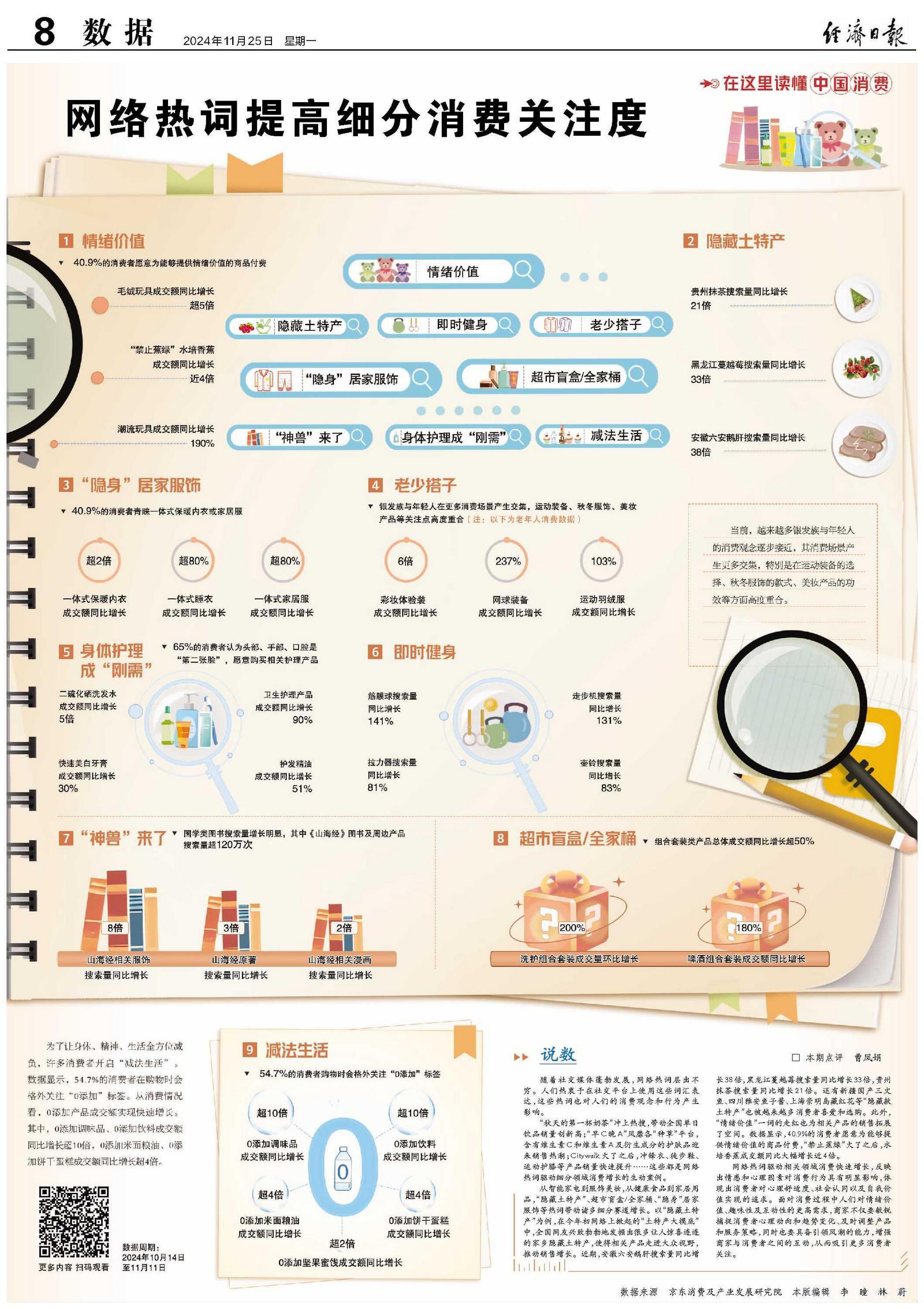 “秋天的第一杯奶茶”冲上热搜,带动全国单日饮品销量创新高;“早C晚A”风靡各“种草”平台,含有维生素C和维生素A及衍生成分的护肤品迎来销售热潮;Citywalk火了之后,冲锋衣、徒步鞋、运动护膝等产品销量快速提升……这些都是网络热词驱动细分领域消费增长的生动案例。