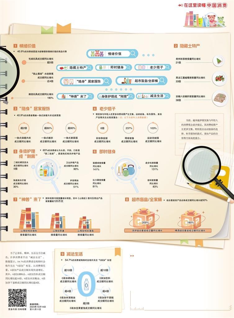 从智能家电到服饰美妆,从健康食品到家居用品,“隐藏土特产”、超市盲盒/全家桶、“隐身”居家服饰等热词带动诸多细分赛道增长。以“隐藏土特产”为例,在今年初网络上掀起的“土特产大摸底”中,全国网友兴致勃勃地发掘出很多让人惊喜连连的家乡隐藏土特产,使得相关产品走进大众视野,推动销售增长。近期,安徽六安鹅肝搜索量同比增长38倍,黑龙江蔓越莓搜索量同比增长33倍,贵州抹茶搜索量同比增长21倍。还有新疆国产三文鱼、四川雅安鱼子酱、上海崇明岛藏红花等“隐藏款土特产”也被越来越多消费者喜爱和选购。此外,“情绪价值”一词的走红也为相关产品的销售拓展了空间。数据显示,40.9%的消费者愿意为能够提供情绪价值的商品付费,“禁止蕉绿”火了之后,水培香蕉成交额同比大幅增长近4倍。