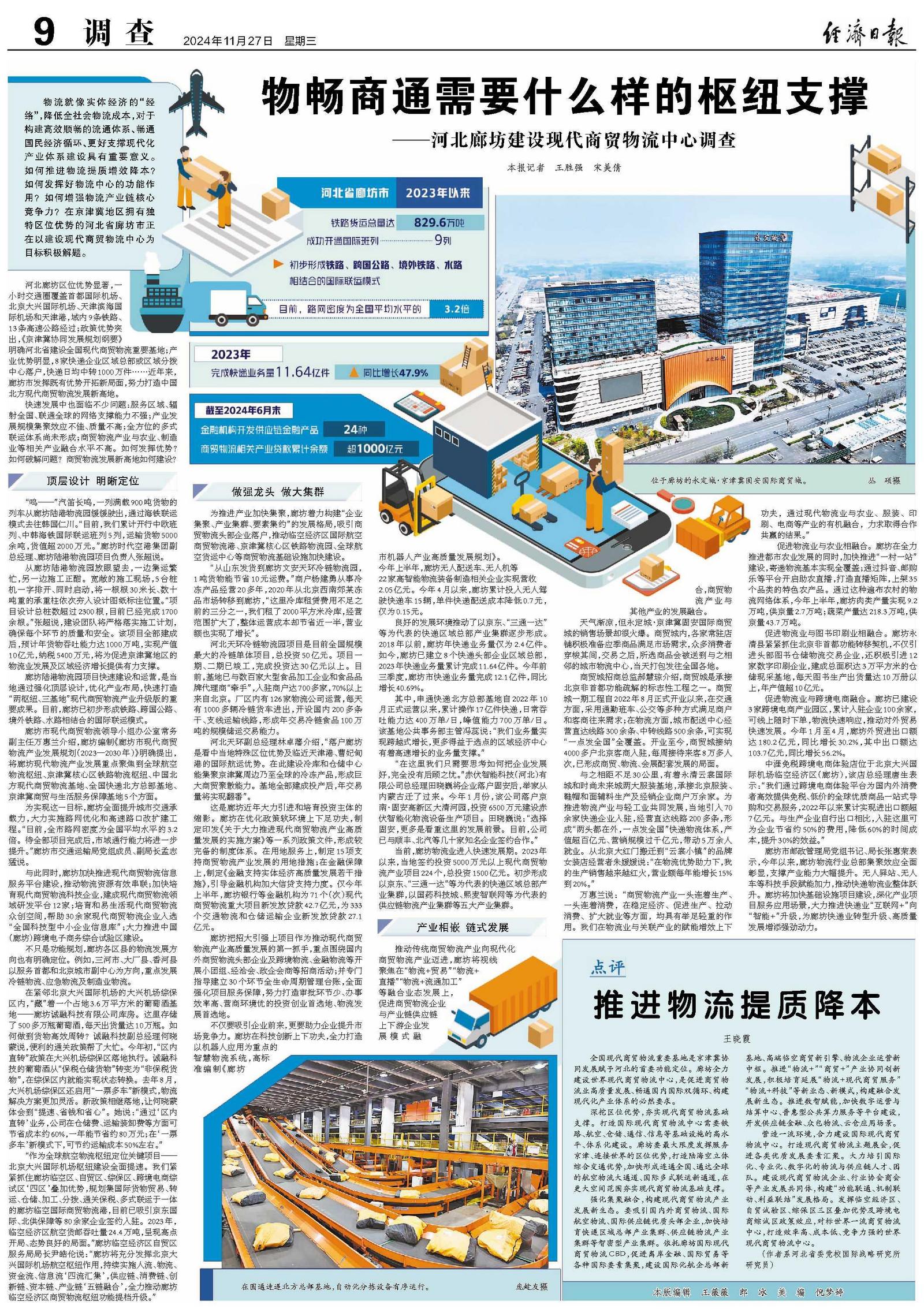 物流就像实体经济的“经络”,降低全社会物流成本,对于构建高效顺畅的流通体系、畅通国民经济循环、更好支撑现代化产业体系建设具有重要意义。如何推进物流提质增效降本?如何发挥好物流中心的功能作用?如何增强物流产业链核心竞争力?在京津冀地区拥有独特区位优势的河北省廊坊市正在以建设现代商贸物流中心为目标积极解题。
