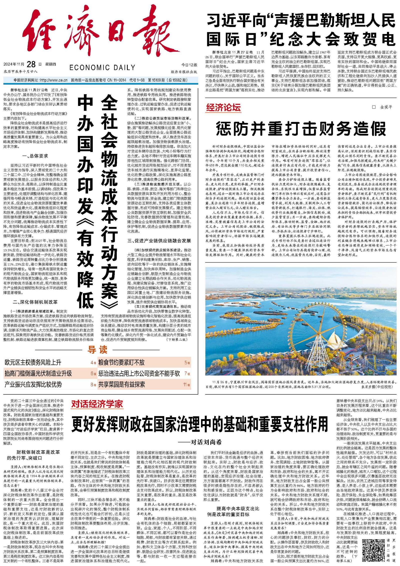 刘尚希:党的二十届三中全会提出进一步全面深化改革的总目标是继续完善和发展中国特色社会主义制度,推进国家治理体系和治理能力现代化。财政是国家治理的基础,深化财税体制改革就是要建立与国家治理体系和治理能力现代化相匹配的现代财政制度。基础没有夯实,就难以实现国家治理体系和治理能力现代化。从历史经验看,财税体制改革是重点,是改革的先行军、突破口。好多改革往往需要财税改革先行,同时不少改革又需要财税去支付改革成本。所以,财税体制改革至关重要,是改革的重点,甚至是改革重点的重点。