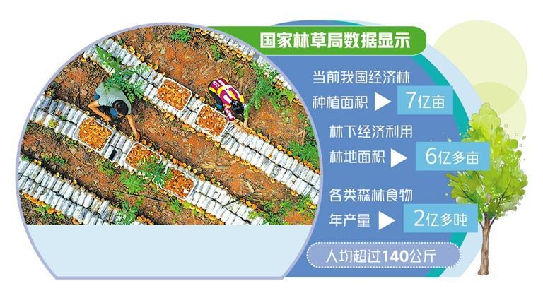 国家林草局数据显示,当前我国经济林种植面积达7亿亩,林下经济利用林地面积6亿多亩,各类森林食物年产量2亿多吨,14亿多人民人均超过140公斤。森林食物已成为继粮食、蔬菜之后的我国第三大农产品,让中国饭碗端得更稳,为我国粮食安全打足了底气。