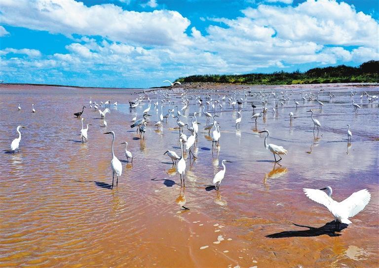 ▼10月30日,候鸟在江苏省南通市如东县小洋口沿海滩涂湿地栖息觅食。