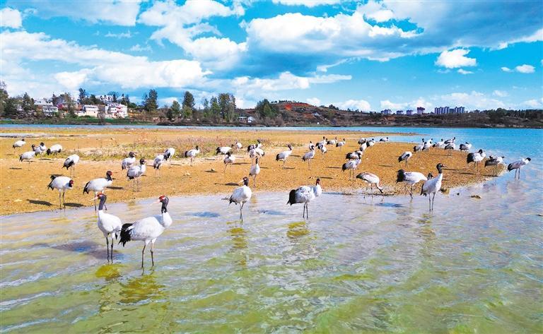 ▶11月24日,在贵州省威宁县锁黄仓国家湿地公园拍摄的越冬候鸟黑颈鹤。