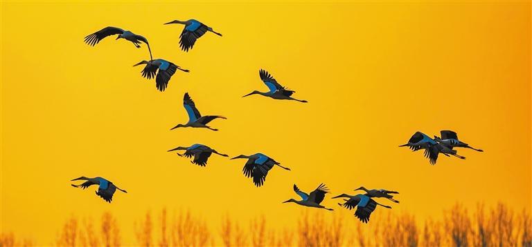 ▲11月22日,东方白鹳在山东省临沂市郯城县沂河上空飞行。