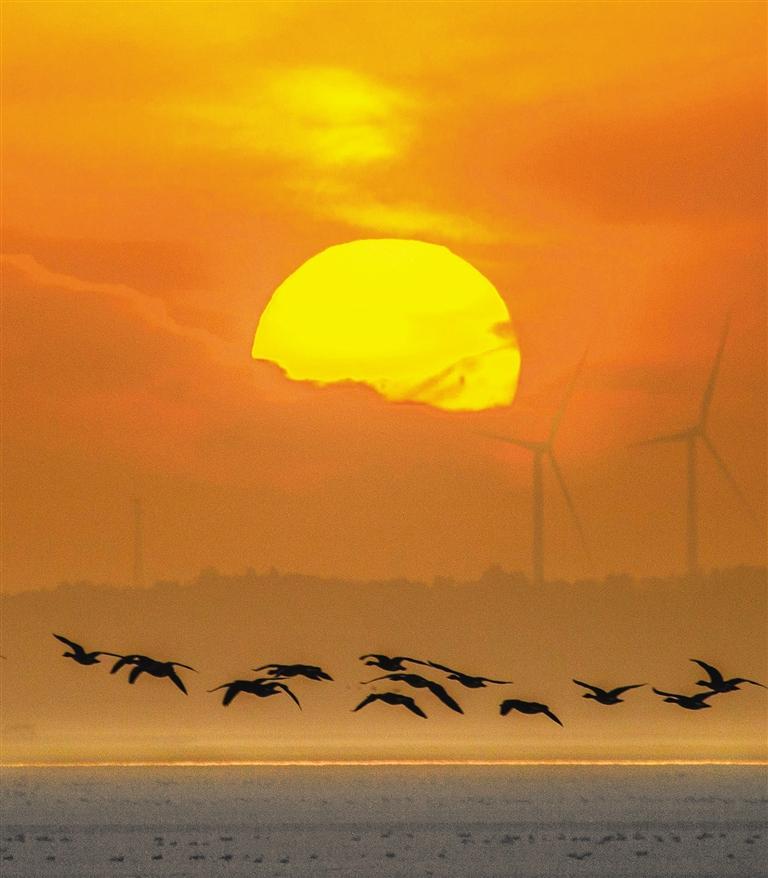 ◀11月7日,江西省都昌县鄱阳湖上空,一群大雁自由飞翔。