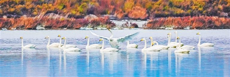 ▲11月9日,野生大天鹅在山西省运城市盐湖湿地越冬,成为一道亮丽的风景。