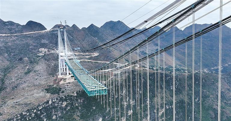 11月30日,建设中的花江峡谷大桥。该大桥是贵州省六枝至安龙高速公路的关键控制性工程。目前,全桥已完成35节段钢桁梁吊装,完成总吊装任务的三分之一。 刘朝富摄 (中经视觉)