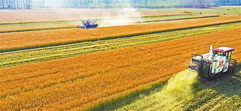 11月30日,江苏省淮安市洪泽区三河镇,田野间泛起一片金黄,农户组织收割机抢收晚稻,确保颗粒归仓。刘 彬摄(中经视觉)