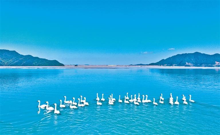 近日,在江西省德兴市铜矿尾矿库,一群天鹅在嬉戏。近年来,德兴市针对尾矿库开展生态修复,通过调控微生物群落抑制产酸,重建植被生态系统,逐步恢复原生态地貌,生态环境明显改善,吸引天鹅、大雁等众多候鸟在此栖息、越冬。