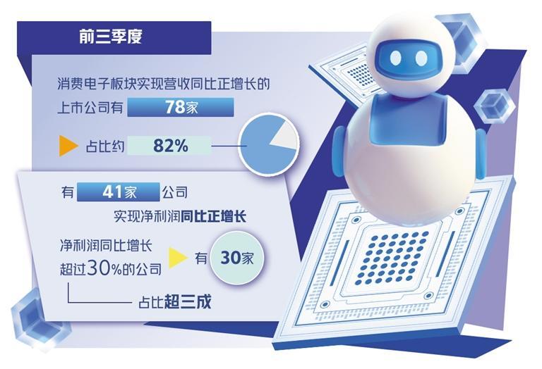 今年以来,消费电子板块复苏明显。数据显示,前三季度,消费电子板块实现营收同比正增长的上市公司有78家,占比约82%;有41家公司实现净利润同比正增长,净利润同比增长超过30%的公司有30家,占比超三成。尤其是第三季度,行业延续复苏趋势,一批公司实现营收、净利润的双增长。