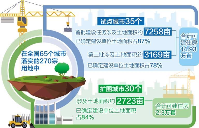 从各地配售型保障性住房用地落实情况看,在全国65个城市落实的270宗用地中,35个试点城市首批建设任务涉及土地面积约7258亩,已经确定建设单位的土地面积占87%,第二批约3169亩,已经确定建设单位的土地面积占78%,合计可建住房14.93万套。30个扩围城市建设任务涉及土地面积约2723亩,已经确定建设单位的土地面积占84%,可建住房2.3万套。