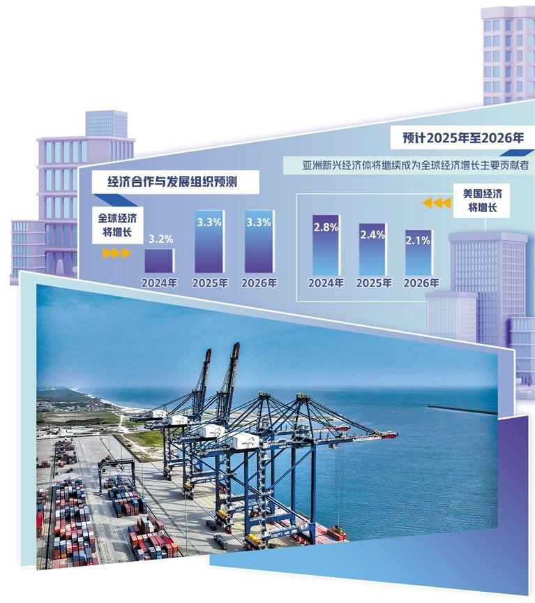 尽管世界经济近年来遭遇重大疫情、地缘关系紧张、能源危机等下行风险的冲击,但仍展现出相当的韧性,经济增长保持相对稳定。报告显示,2024年虽然部分国家经济出现下滑,但整体上全球经济增长保持稳定。经合组织预计,2025年和2026年全球国内生产总值(GDP)将保持3.3%的增速。