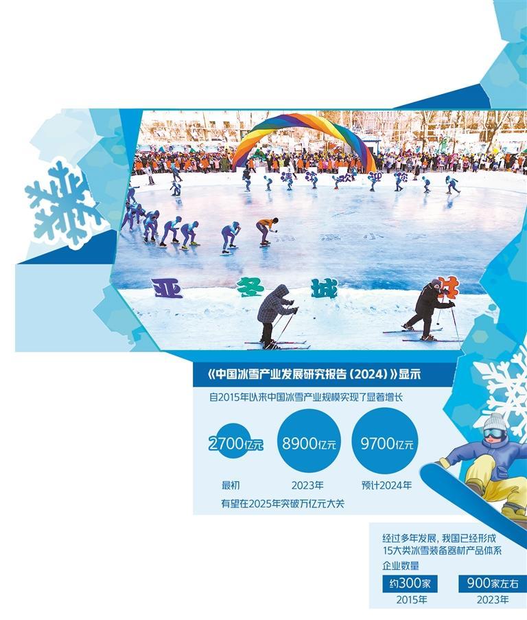 当前,我国冰雪产业正处于快速发展阶段,市场规模持续扩大、消费者需求日益多样化、产业链条更加完善。《中国冰雪产业发展研究报告(2024)》显示,自2015年以来中国冰雪产业规模实现了显著增长,从最初的2700亿元迅速扩张到2023年的8900亿元。预计2024年产业规模将达到9700亿元,有望在2025年突破万亿元大关。