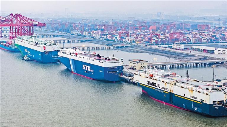 12月12日,江苏省苏州港太仓港区,海通(太仓)汽车码头正式开港。当日,3艘滚装船同时靠泊码头,“列队”作业,标志着长江干线最大的汽车滚装码头正式投入生产运营,助力国产汽车走向世界。据了解,该汽车码头岸线长708米,设计年汽车吞吐量130万辆。