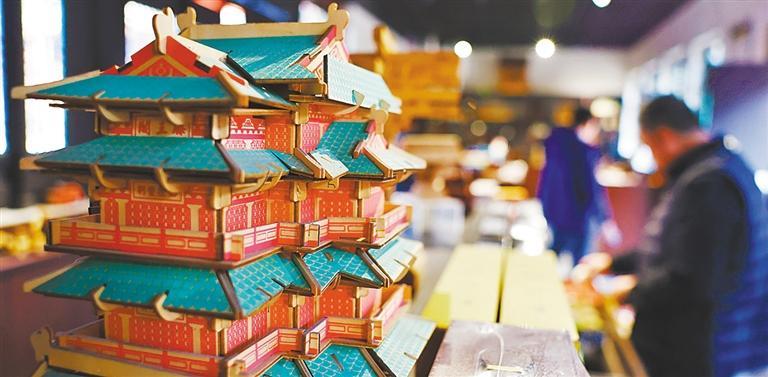 ◀11月7日,山西太原市古典传统艺术博物馆文创店,古建筑拼装潮玩模型以纸为材,拼装为法,深受消费者喜爱。