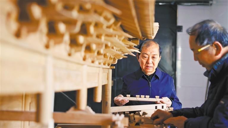 ▲11月7日,国家级古建筑模型制作技艺非遗传承人祁伟成(左)在制作古建模型。他先后参与多项文物保护修缮工作,主持制作了100余套古建筑模型。