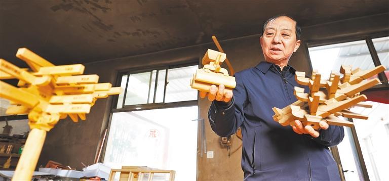 ▼11月7日,国家级古建筑模型制作技艺非遗传承人祁伟成在展示不同朝代的斗拱。斗拱通过榫卯之间纵横交错的组合,在不使用一根金属连接件的情况下,让建筑可以屹立千年。