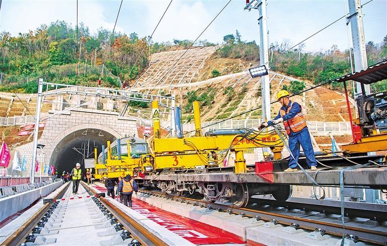 十二月十五日拍摄的渝厦高铁重庆东至黔江段武隆区白马山隧道出口施工现场。当日,渝厦高铁重庆东至黔江段全线铺轨完成。工程建成通车后,将大大缩短重庆主城区至黔江区的列车旅行时间。