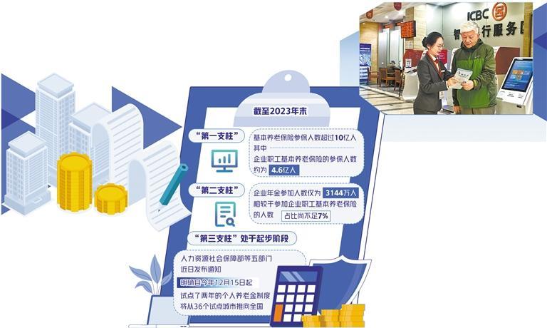 然而,养老保障这“三个支柱”的“粗细”却各有不同。人力资源社会保障部发布的数据显示,截至2023年末,“第一支柱”基本养老保险参保人数超过10亿人,基本实现全面覆盖;其中,企业职工基本养老保险的参保人数约为4.6亿人。然而,已经过20年发展的“第二支柱”企业年金却规模很小,参加人数仅为3144万人,相较于参加企业职工基本养老保险的人数,占比尚不足7%。“第三支柱”更是处于起步阶段,人力资源社会保障部等五部门近日发布通知,明确自今年12月15日起,试点了两年的个人养老金制度将从36个试点城市推向全国。