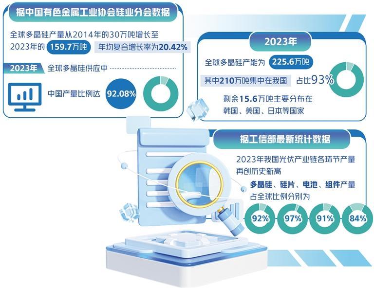 目前,我国是全球最大的多晶硅生产、消费和进口国。据中国有色金属工业协会硅业分会数据,全球多晶硅产量从2014年的30万吨增长至2023年的159.7万吨,年均复合增长率为20.42%。2023年,全球多晶硅供应中,中国产量比例达92.08%,占据绝对主导地位。