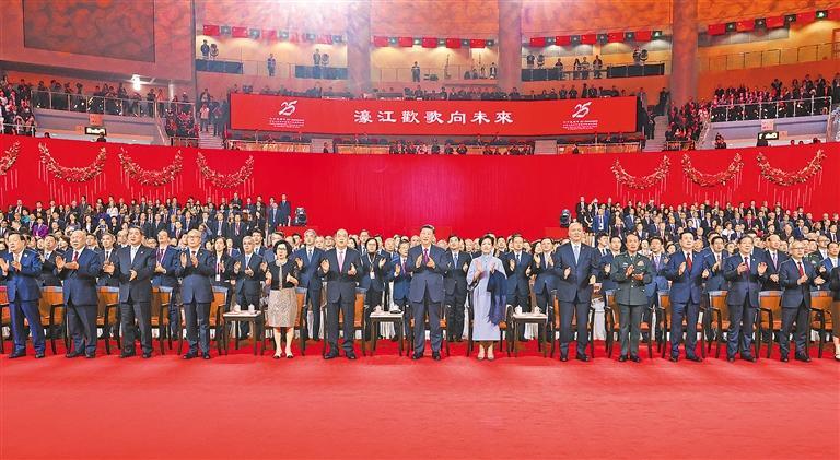 新华社澳门12月19日电(记者赵博、张研)镜海扬帆风正劲,濠江欢歌向未来。庆祝澳门回归祖国25周年文艺晚会19日晚在澳门东亚运动会体育馆举行。中共中央总书记、国家主席、中央军委主席习近平观看了演出。