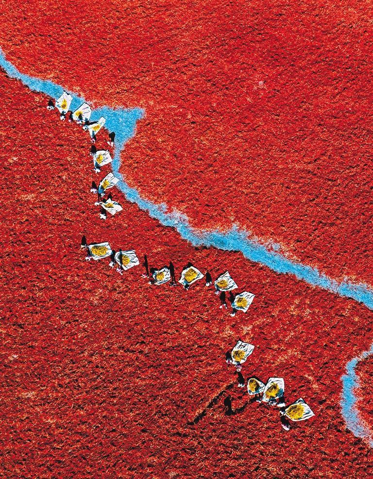 ▼新疆塔城地区博尔通古牧场,农民在晾晒辣椒。