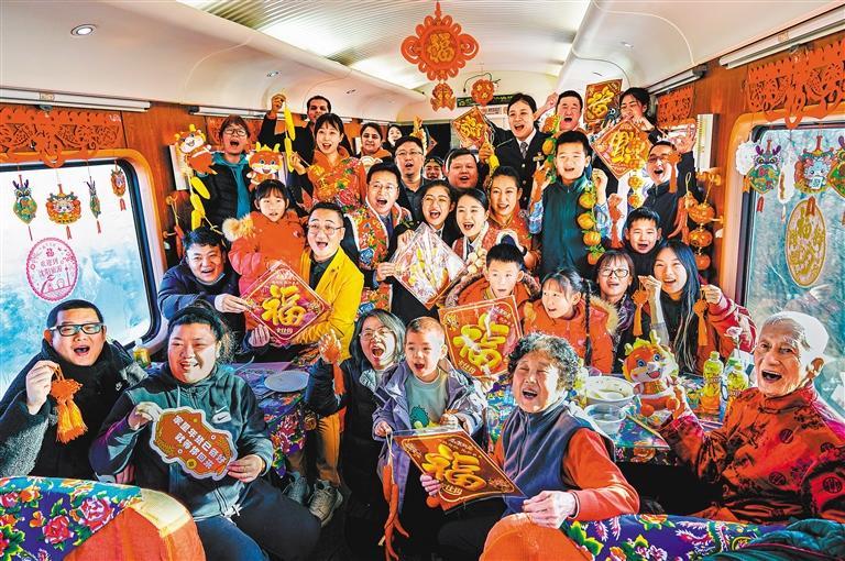 ▲在辽宁沈阳市至广东广州市的Z12次列车上,旅客和列车组工作人员欢乐互动。